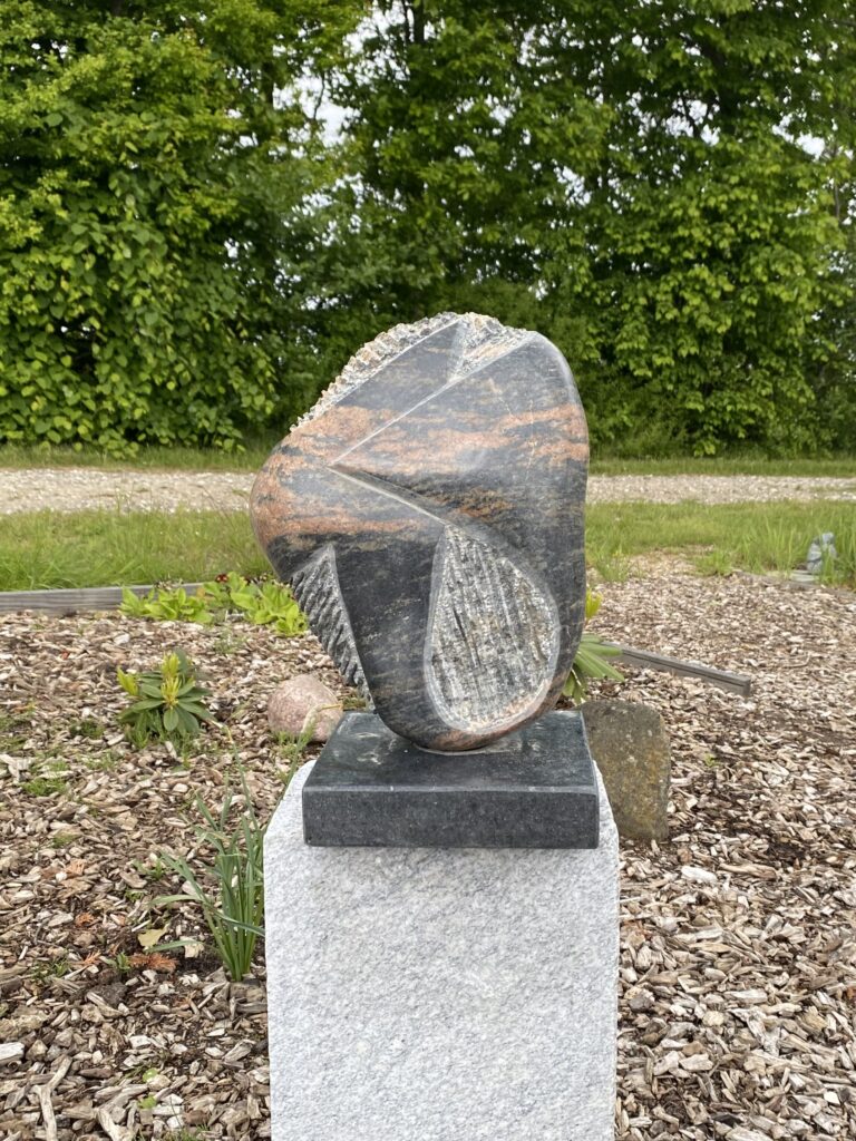 Denne skulptur omfavner de rå og skarpe flader. Et symbol på at rumme livets svære følelser. Det omfavnende bånd er blødt svunget rundt om skulpturen.